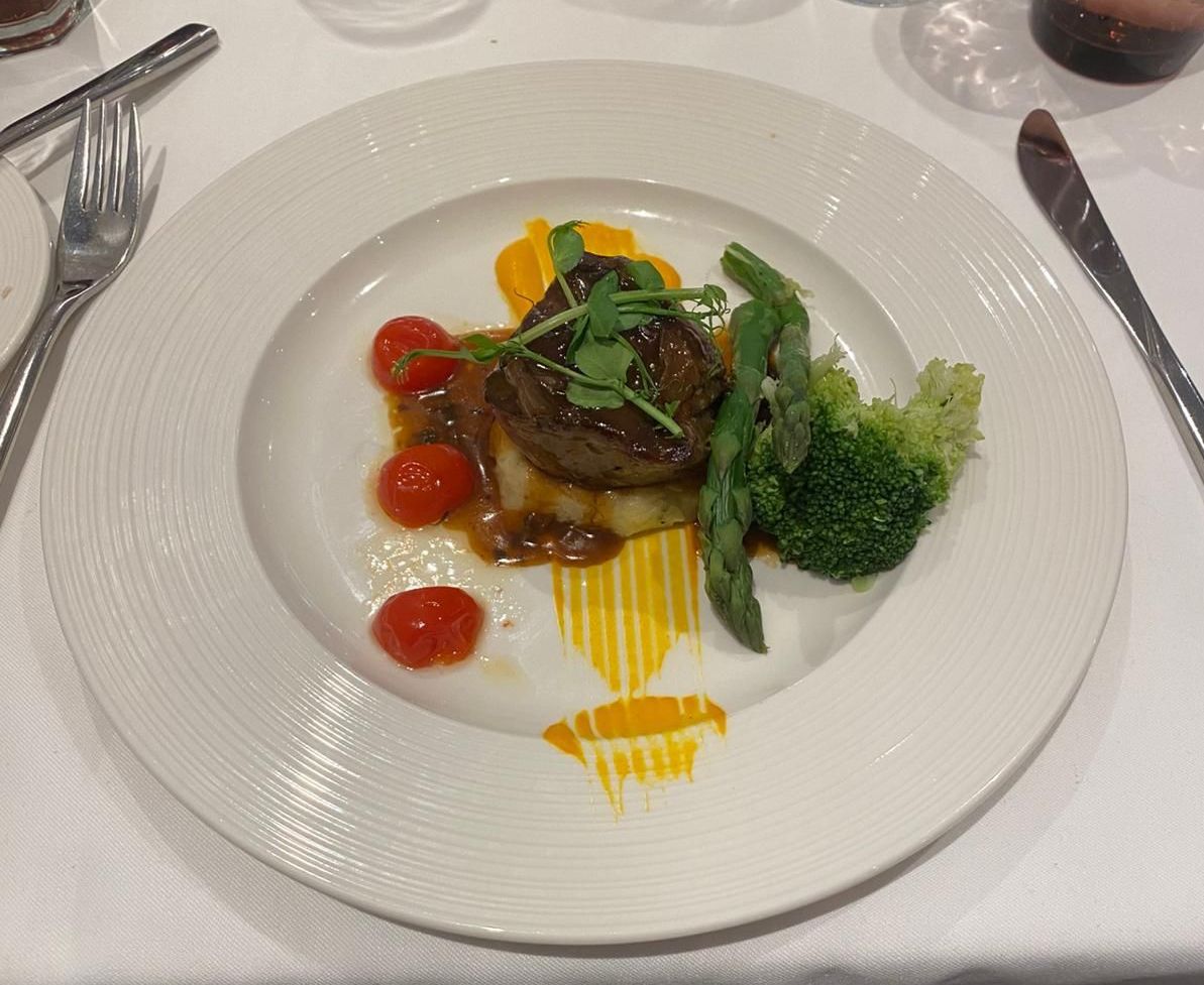 Mains: Keira chose the grilled beef tenderloin, which was cooked to perfection and practically melted in her mouth. I had the butter chicken with rice and thin naan bread—absolutely delicious with a creamy, mild spice.